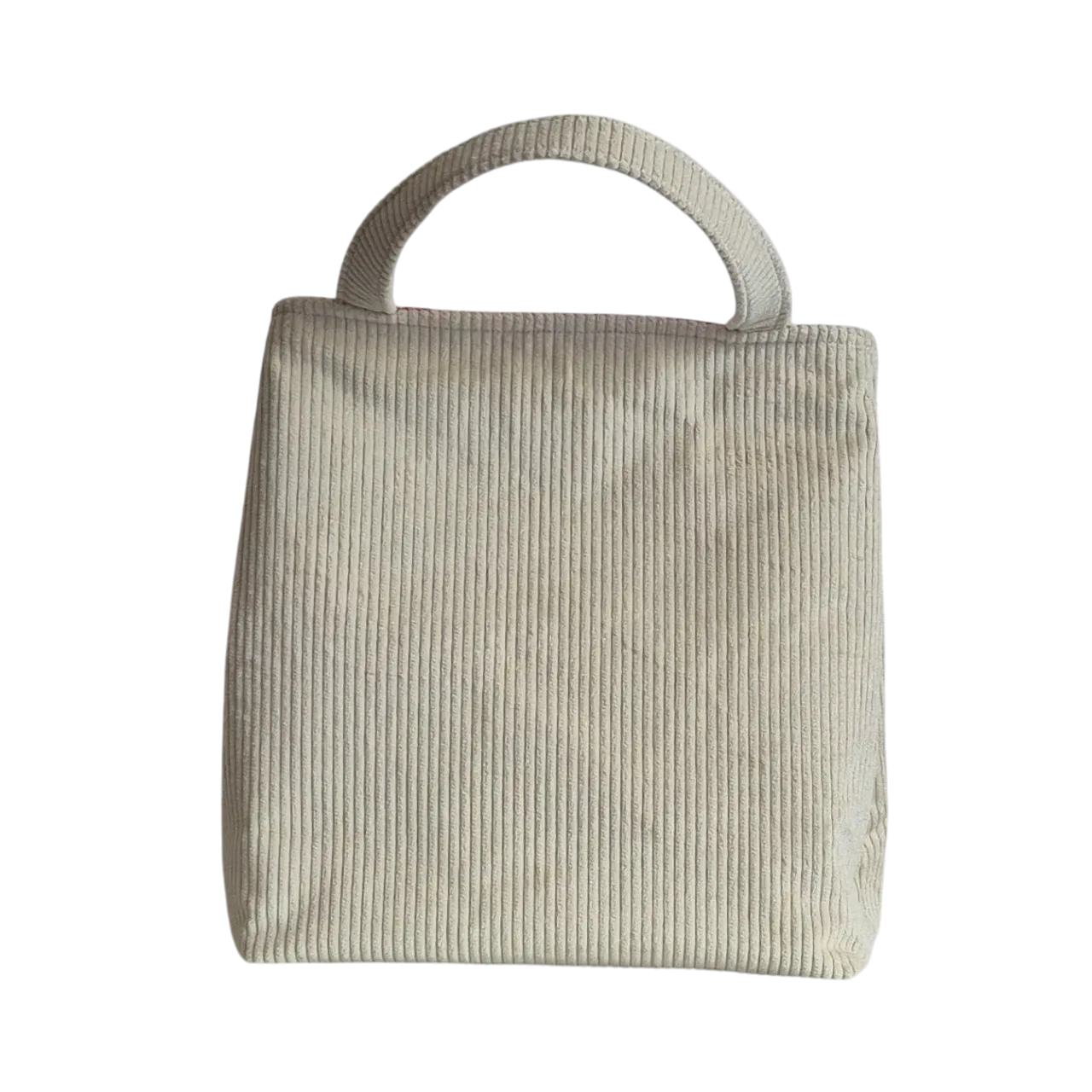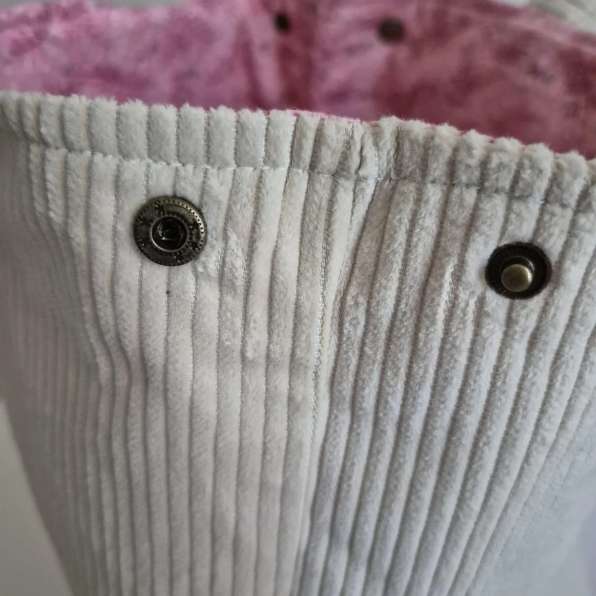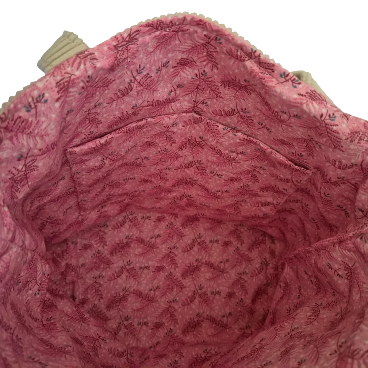 Mooie beige tas van corduroy stof met een roze voering met blaadjes en witte stipjes. De tas kan aan de bovenkant smaller worden gemaakt door drukkers aan de zijkant. Aan de binnenzijde van de tas zitten twee vakken. Deze tas is ook in het rood en roze verkrijgbaar.