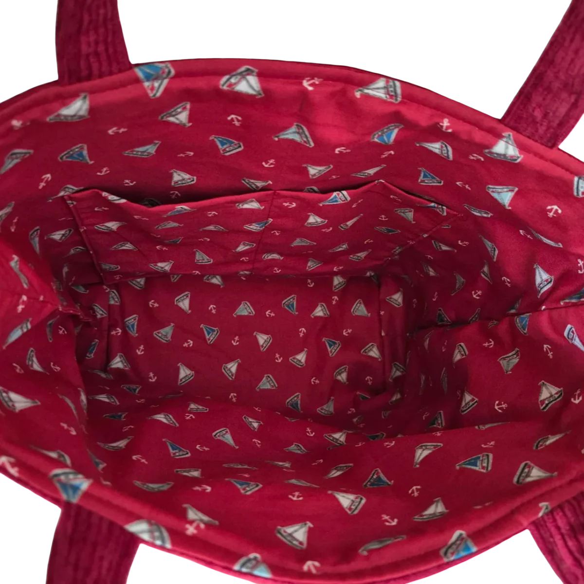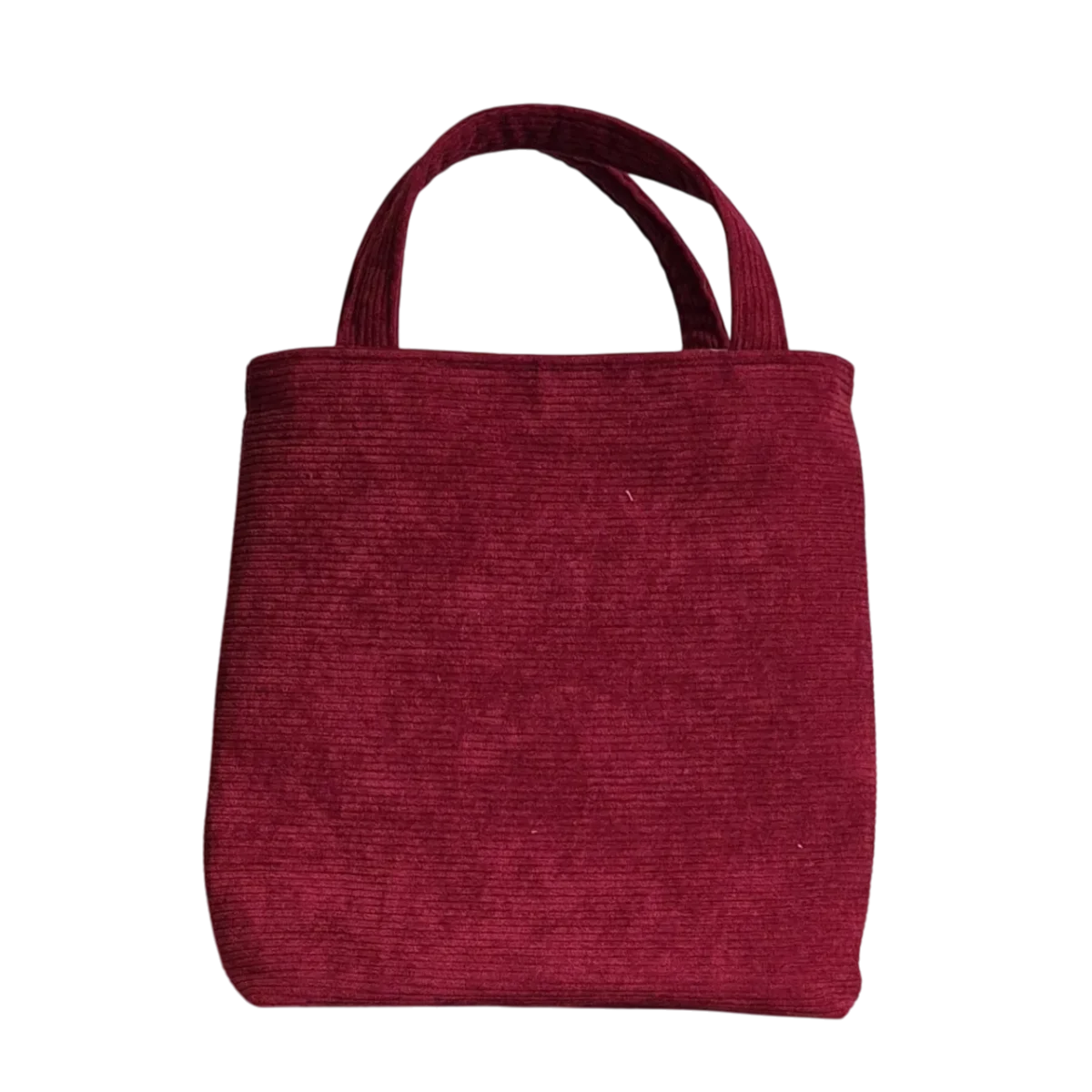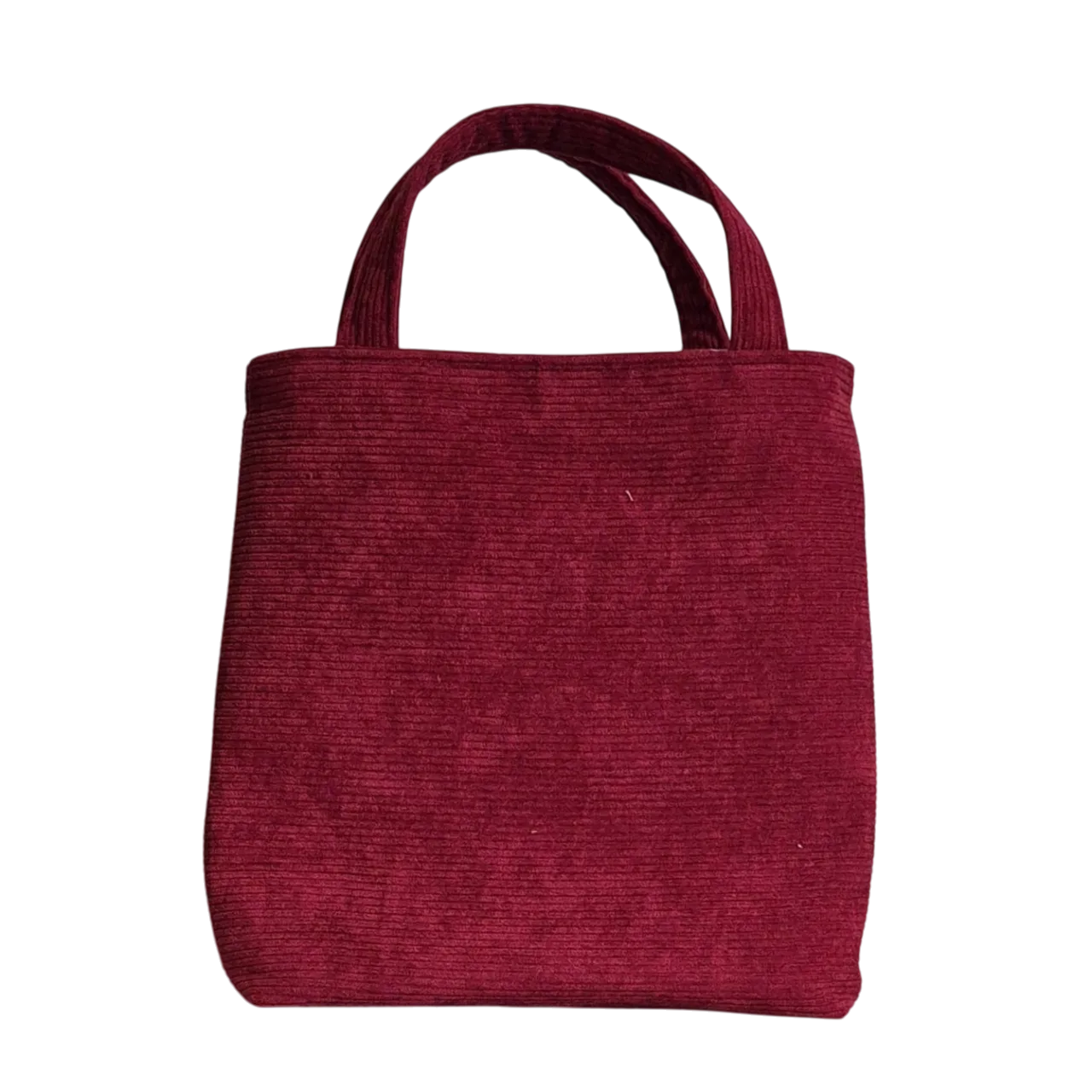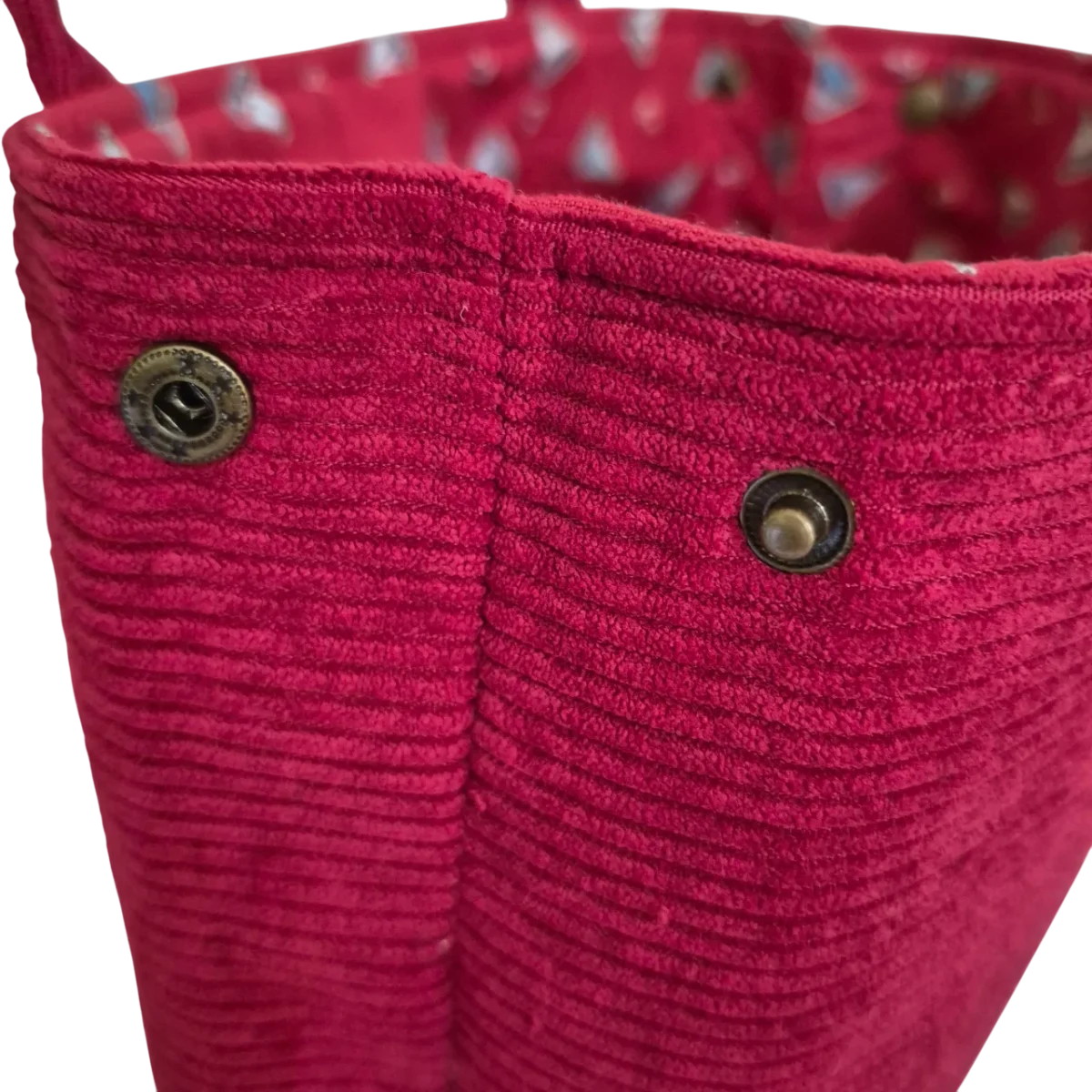 Mooie donkerrode tas van corduroy stof met een vrolijke rode voering met bootjes. De tas kan aan de bovenkant smaller worden gemaakt door drukkers aan de zijkant. Aan de binnenzijde van de tas zitten twee vakken. Deze tas is ook in het beige en roze verkrijgbaar.
