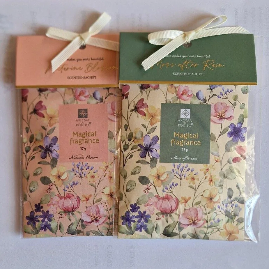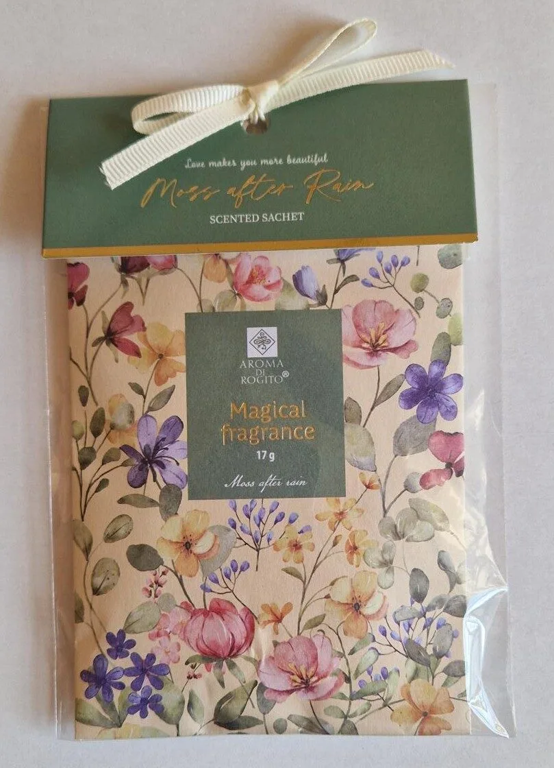 Heerlijk geurzakje voor in de kast bij je stoffen of in de kledingkast. Er zijn 2 geuren in deze serie van Aroma di Rogito: Moss after rain en Nectarine blossom.