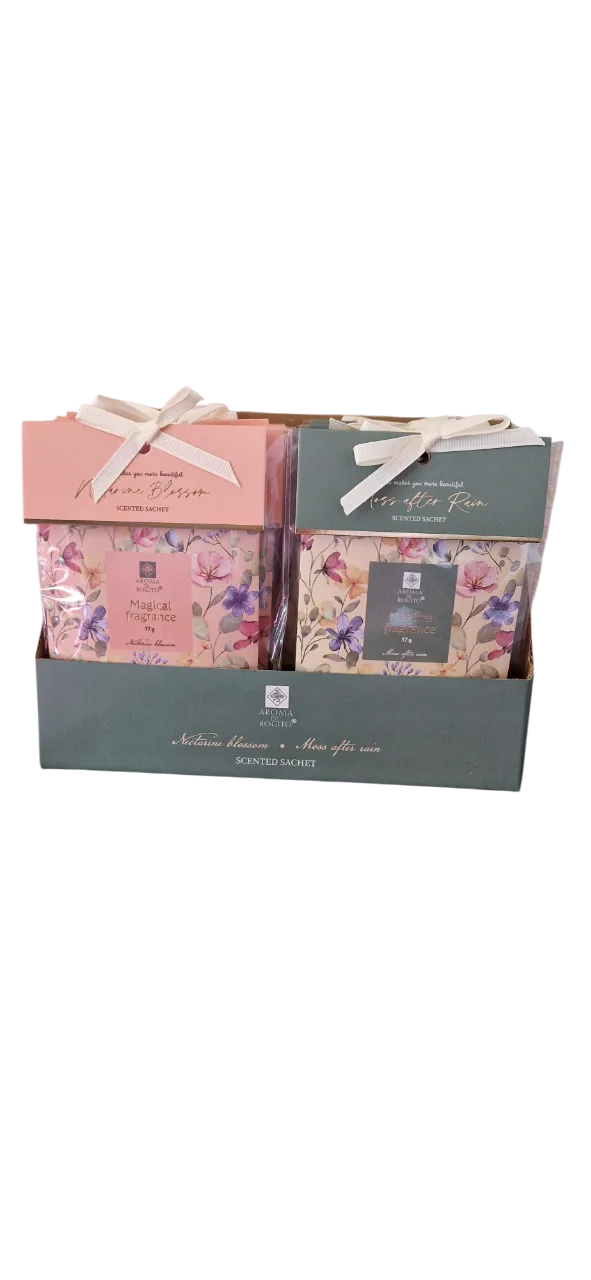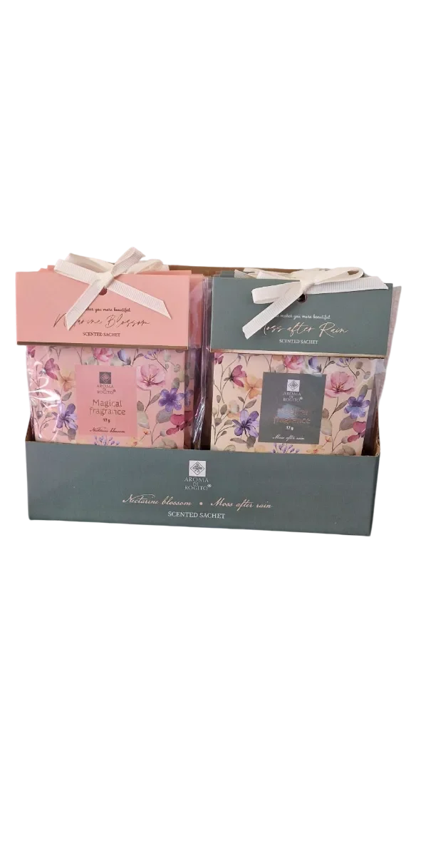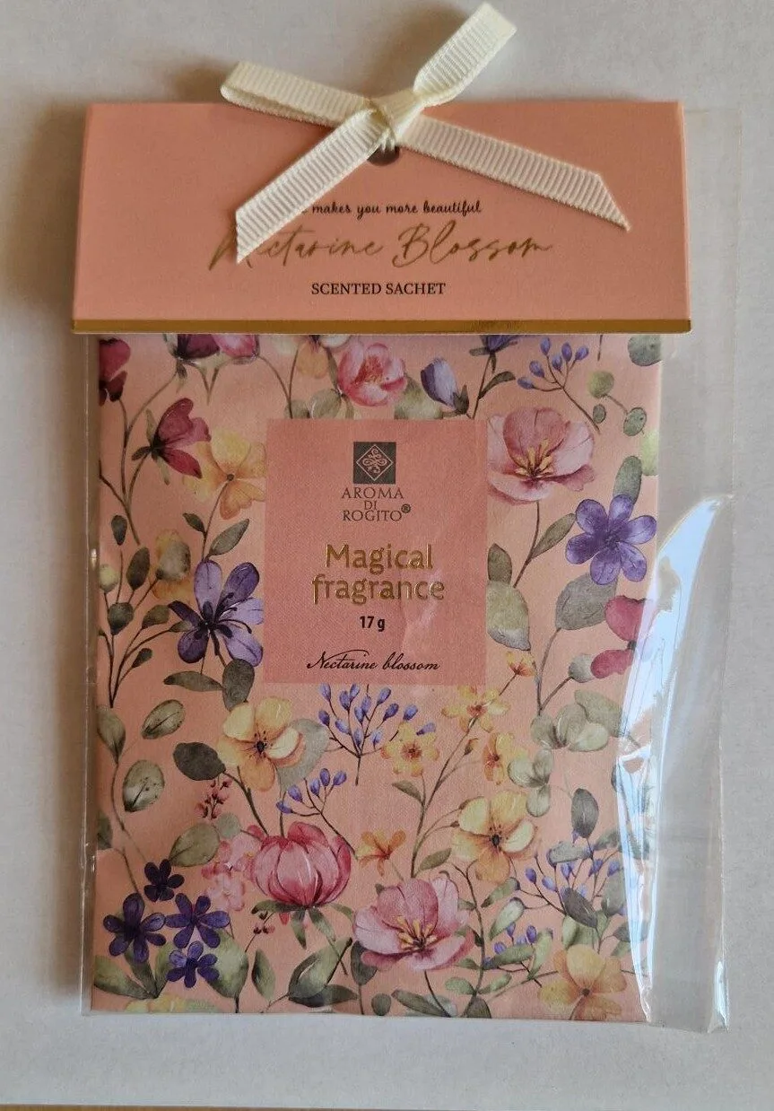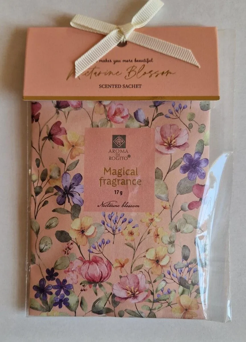 Heerlijk geurzakje voor in de kast bij je stoffen of in de kledingkast. Er zijn 2 geuren in deze serie van Aroma di Rogito: Moss after rain en Nectarine Blossom.