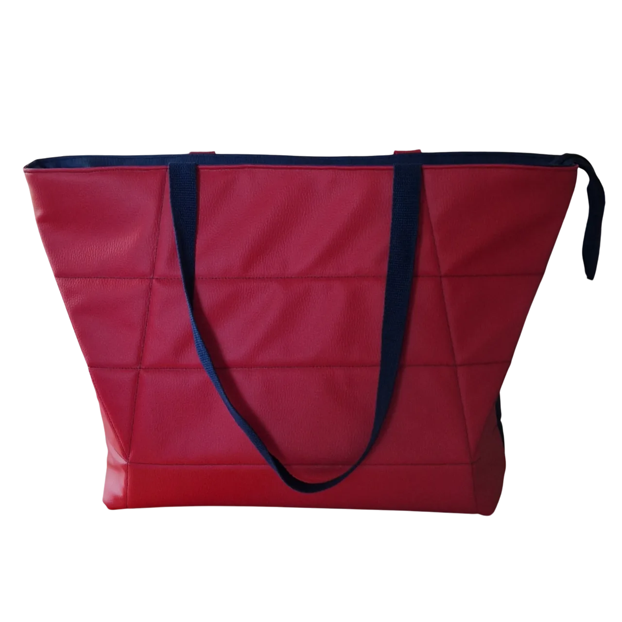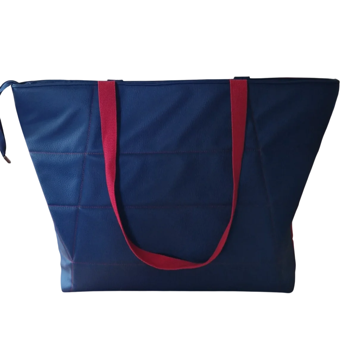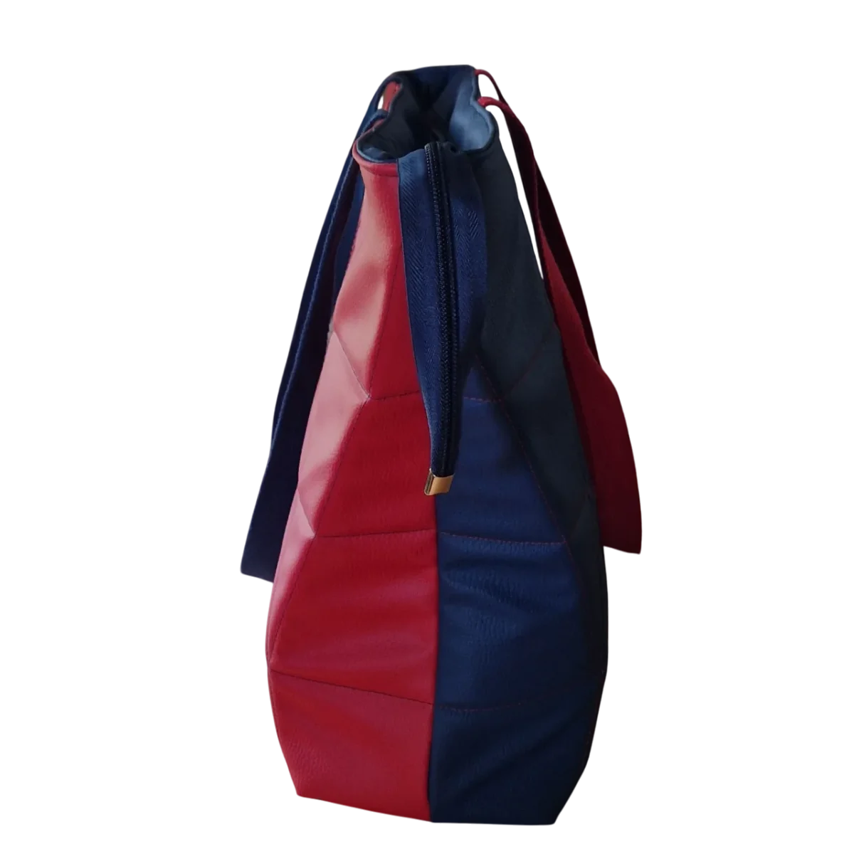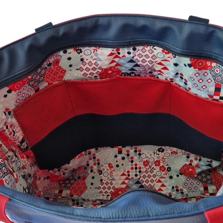 Mooie handige grote tas van kunstleer, gevoerd met een vrolijke stof met hexagons. Deze tas heeft aan de binnenkant 3 vakken van kunstleer en is afsluitbaar met een rits.