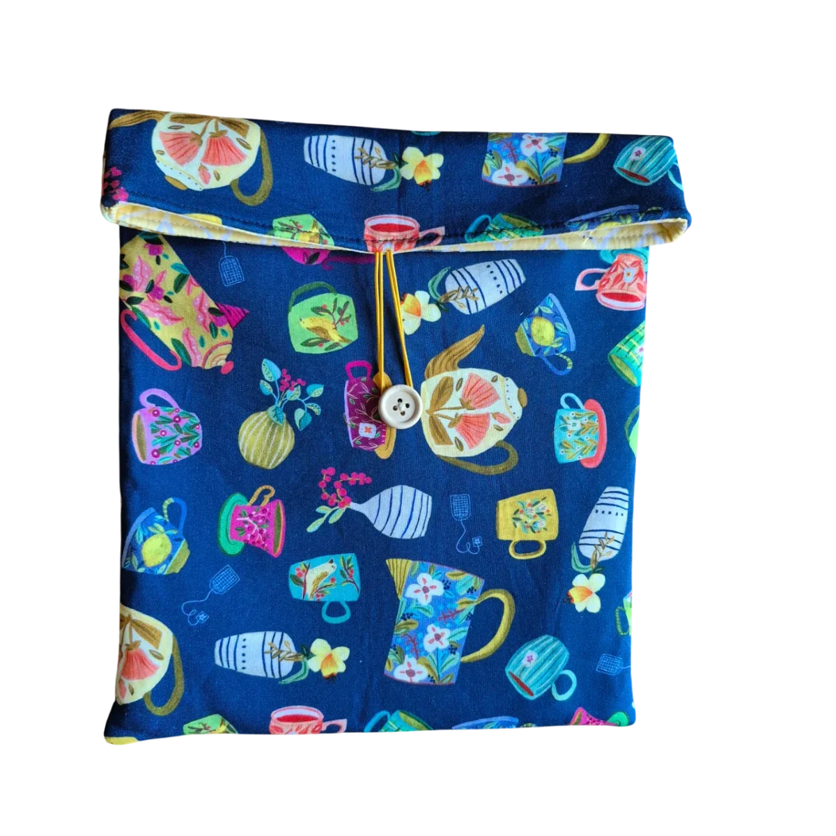 Deze leuke tas is gemaakt van een grappige katoenen stof en een zachte tussenvulling die je tablet/laptop goed beschermt. De tas sluit met een flap en een elastiekje dat je eenvoudig vastmaakt aan een knoop. Door het leuke motief van kopjes, bekers en theepotjes krijgt de tas een gezellige uitstraling. Perfect geschikt voor een laptop, tablet, remarkable of zelfs een boek.