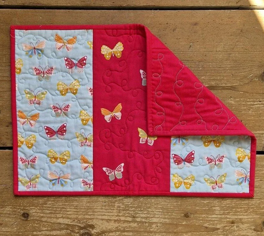 Vrolijke placemat met vlinders met aan de achterkant roze stof.