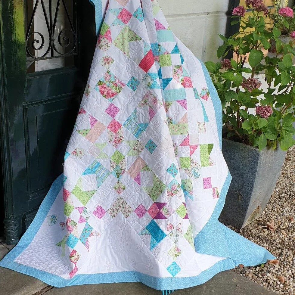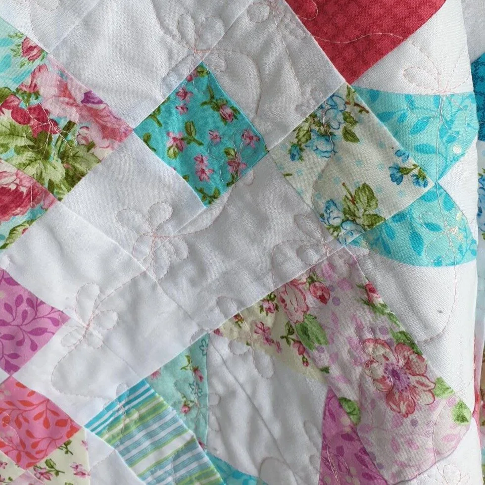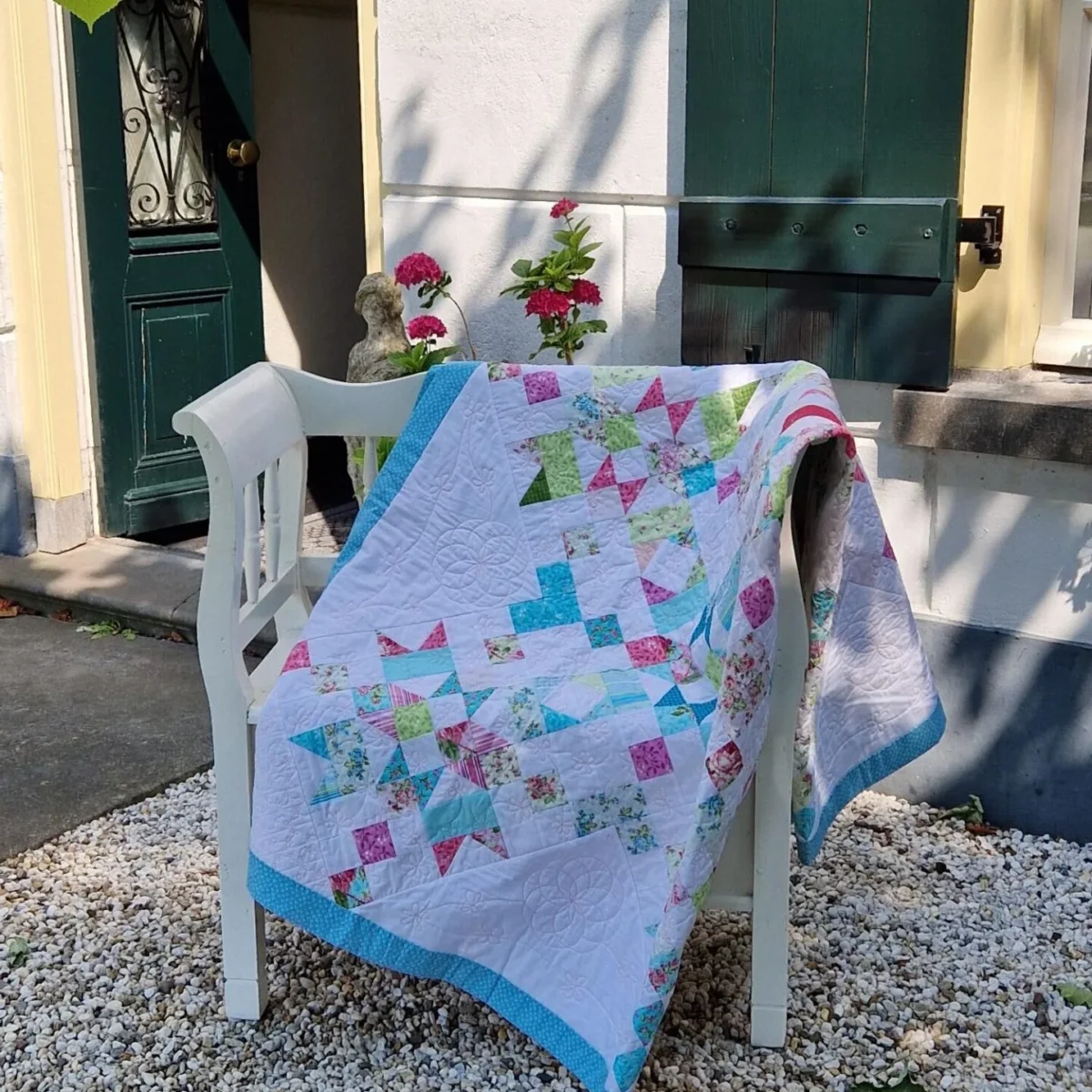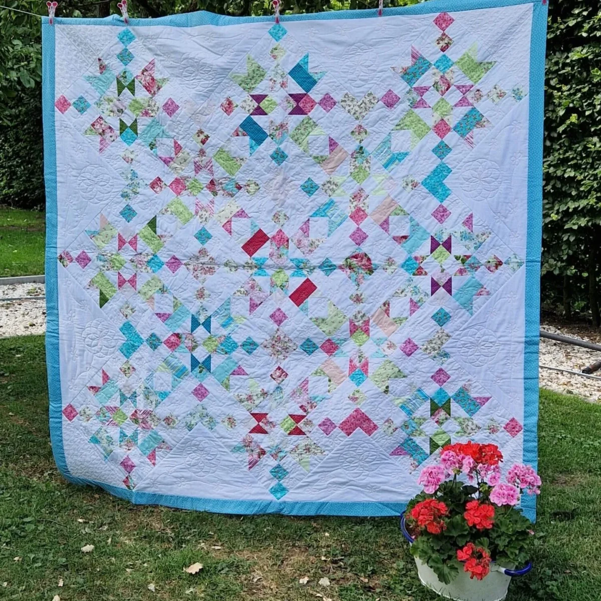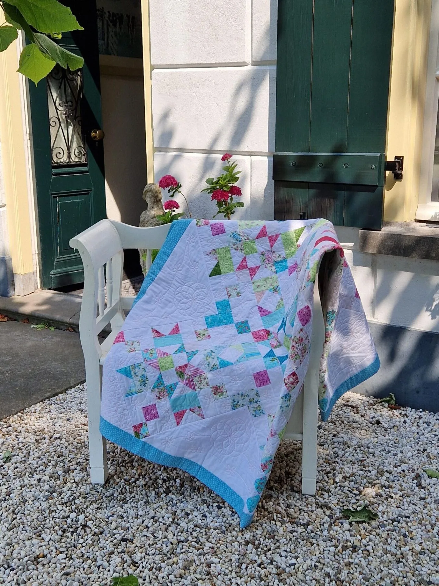 Deze prachtige quilt is gemaakt van een jelly roll. Door de diversiteit aan kleuren geeft deze quilt een vrolijke uitstraling met hier en daar een glimmertje op een stofje, wat nog meer “sprankel” aan de quilt geeft. De quilt is machinaal doorgequilt met diverse motieven. De achterkant van deze quilt is een lichtblauwe katoenen stof met witte vinkjes.