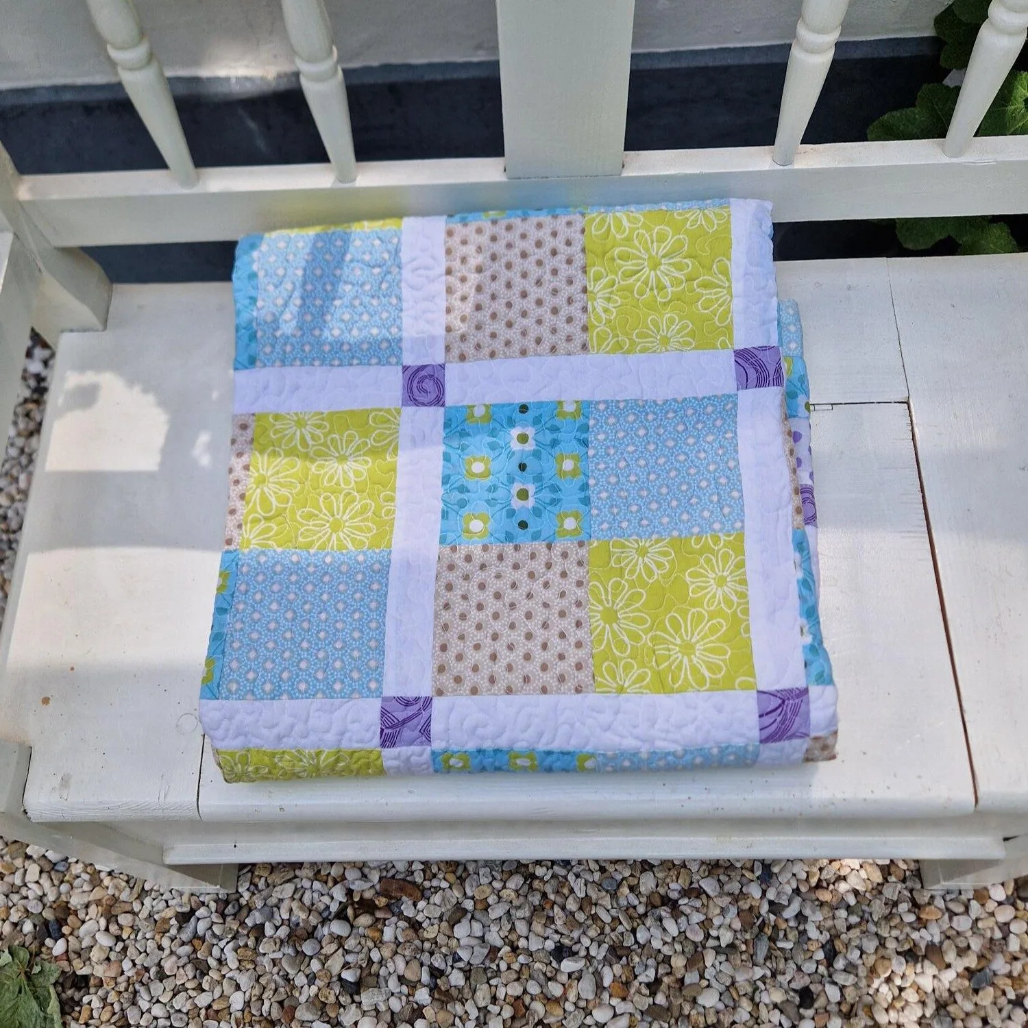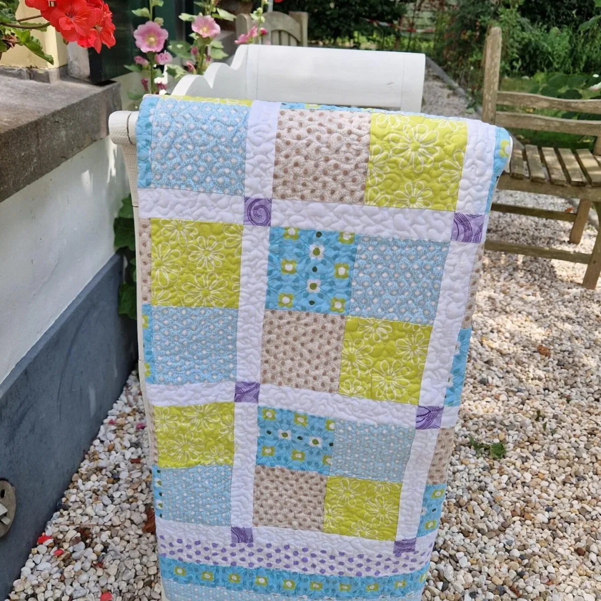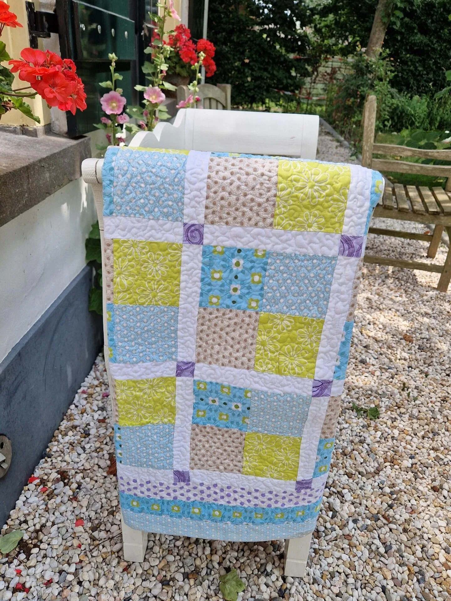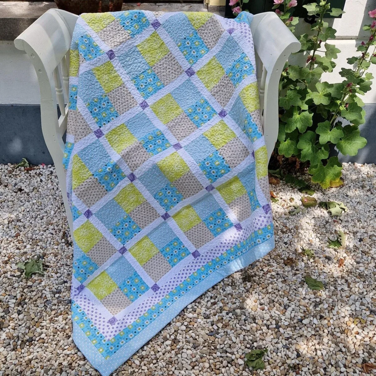 Deze zomerse quilt heeft een vrolijk kleurenpalet van lichtblauw, lichtgroen, lichtbruin, lila, aqua en wit. De speelse blokken zijn zorgvuldig in elkaar gezet en worden omlijst door witte stroken en lila blokjes. De quilt is machinaal doorgequilt. De achterkant van de quilt is een witte stof met lila stippen.