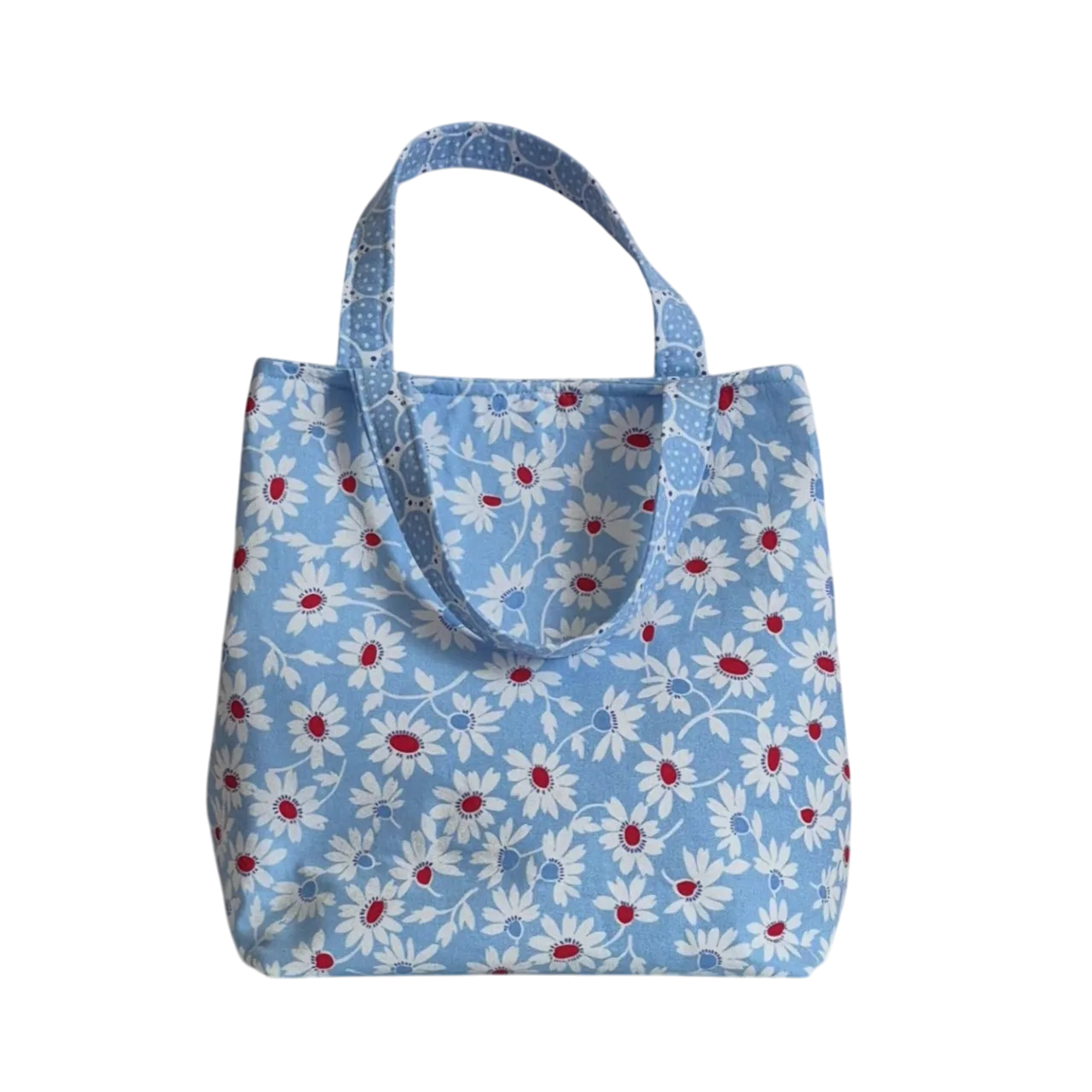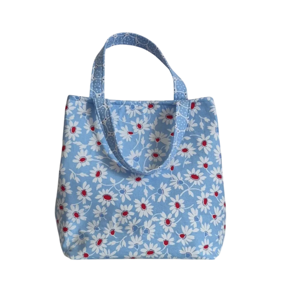 Zomerse tas met vrolijke bloemen en gevoerd met lichtblauwe bijpassende stof. De tas gaat dicht met een magneetsluiting en aan de zijkant zitten drukkers om de tas smaller te maken.